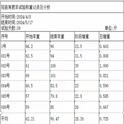 本次实验以豆泊羊为对象,初始均重66.2斤,经过精准配比饲喂我厂浓缩料39天后,羊只均重突破90斤,日均增重稳定在0.603斤,总增重率高达36%。实验全程由十里铺养殖场技术团队记录,数据真实可靠。养殖场负责人李某某表示:对比传统饲料,浓缩料的营养转化效率显著提升,羊群健康状态稳定,皮毛光亮,为后续规模化推广提供了有力依据。”