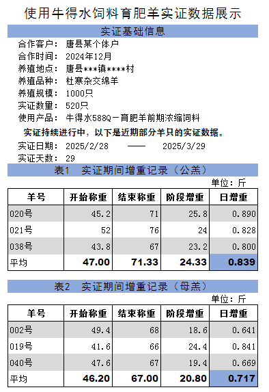 近日,河北省唐县仁厚镇房庄村的养殖个体户聂某先生,在其千只规模的杜寒杂交绵羊养殖场中,使用了牛得水588Q—育肥羊前期浓缩饲料进行科学育肥,取得了令人瞩目的成效。经过29天的实证观察,公羔羊平均日增重达0.839斤,母羔羊平均日增重达0.717斤,充分展现了牛得水饲料在促进羊只快速增重方面的卓越性能。